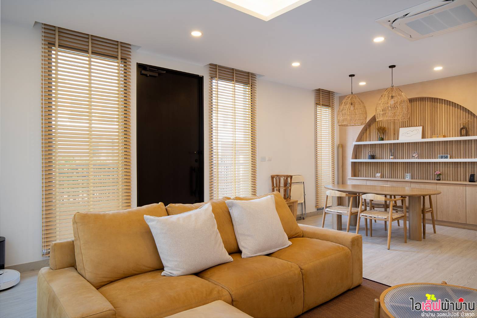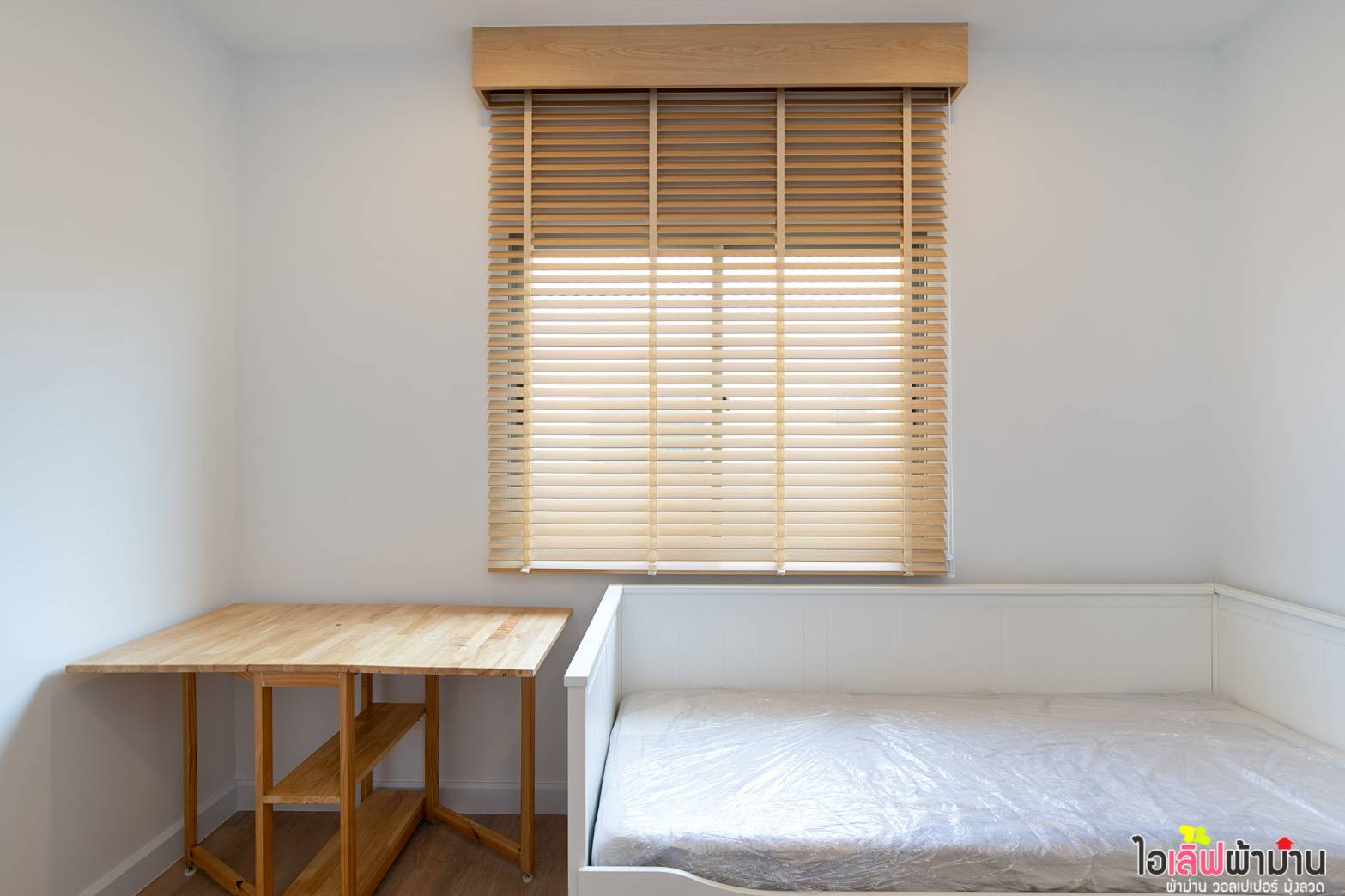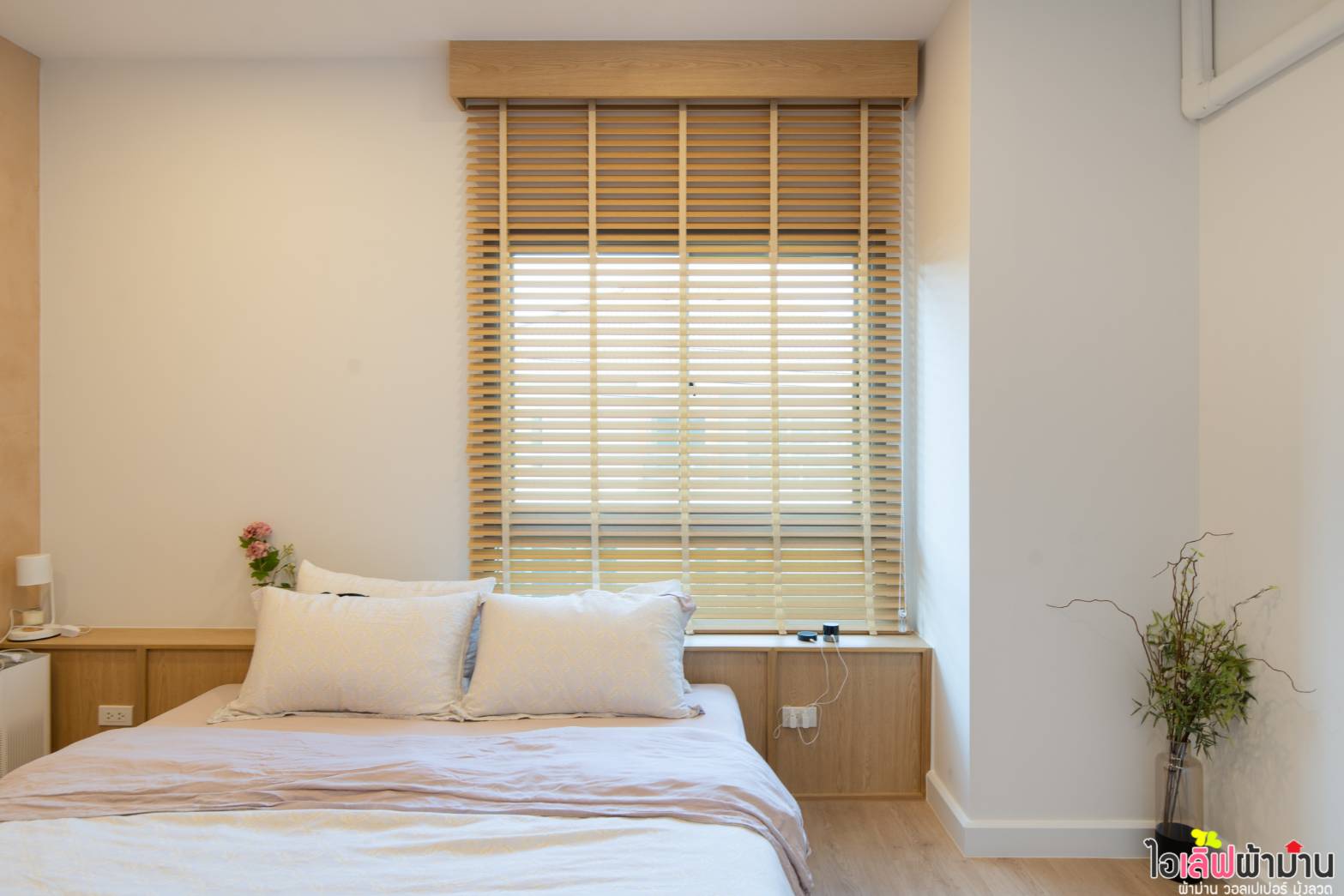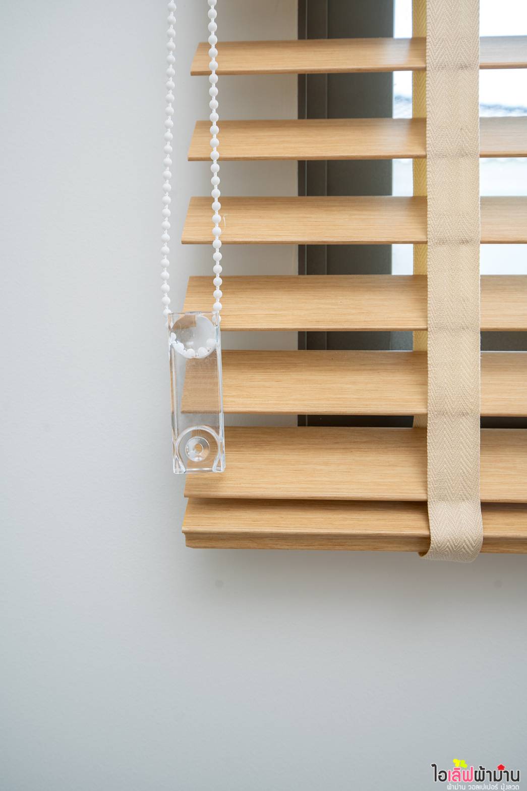 ส่วนมู่ลี่จะเป็นมู่ลี่ไม้ เลือกสีที่เป็นธรรมชาติตัดกับเทปสีขาวงาช้าง ระบบโซ่วน วัสดุจากWinterior