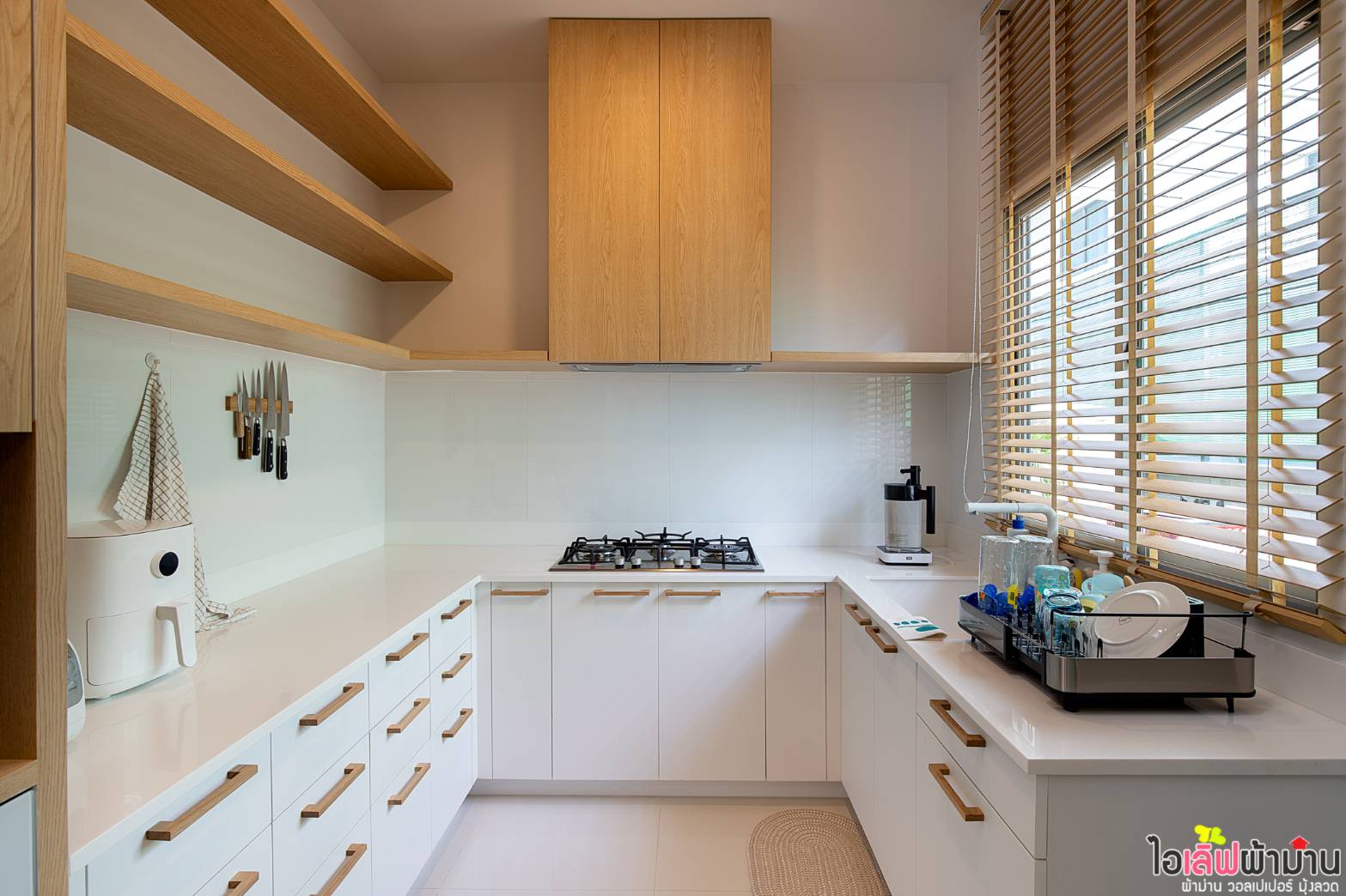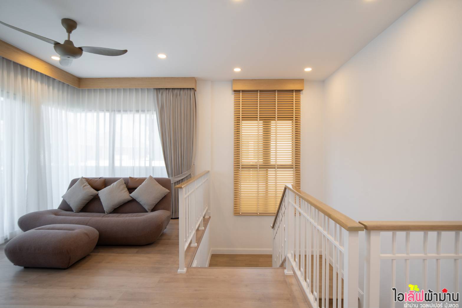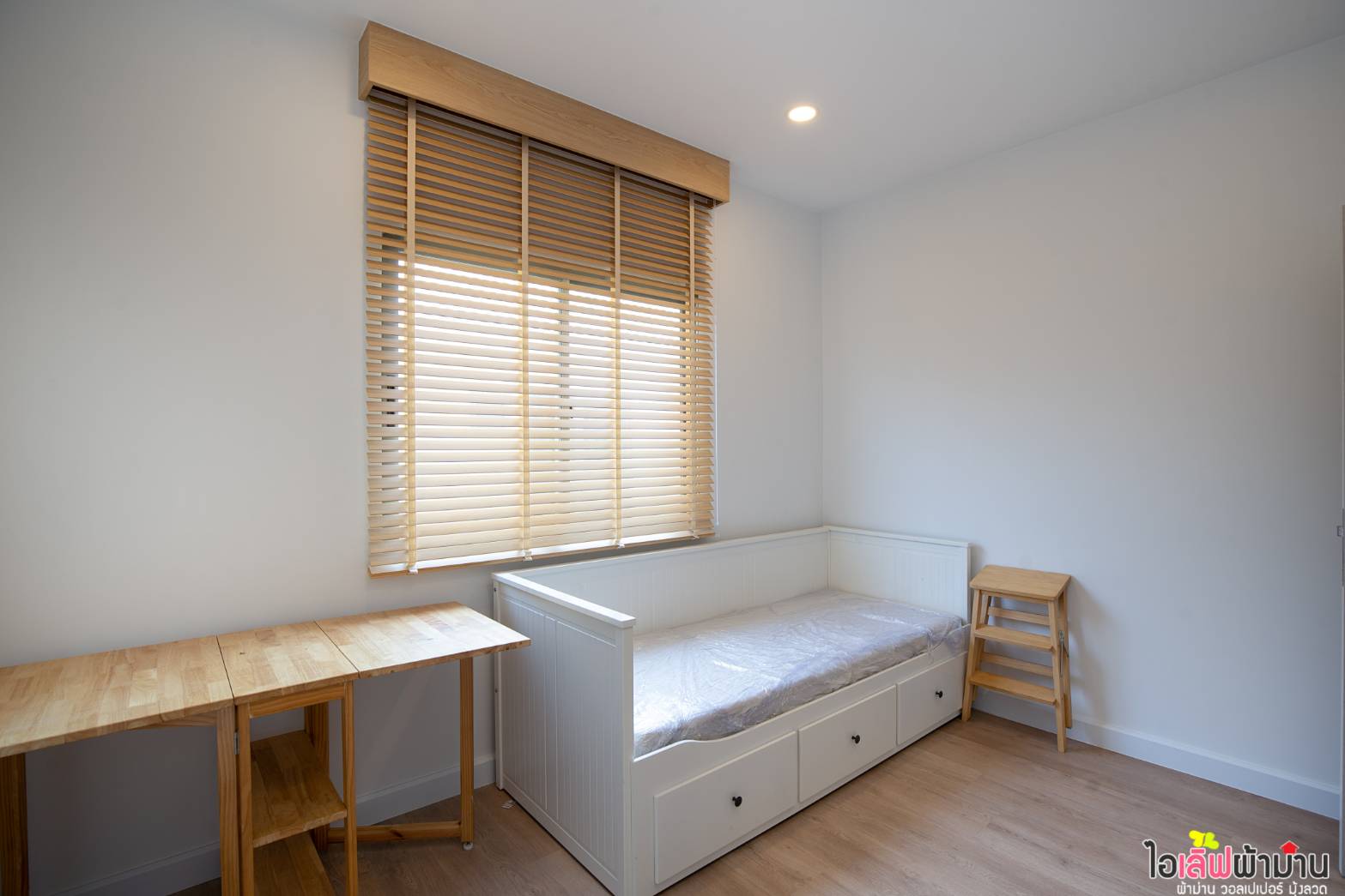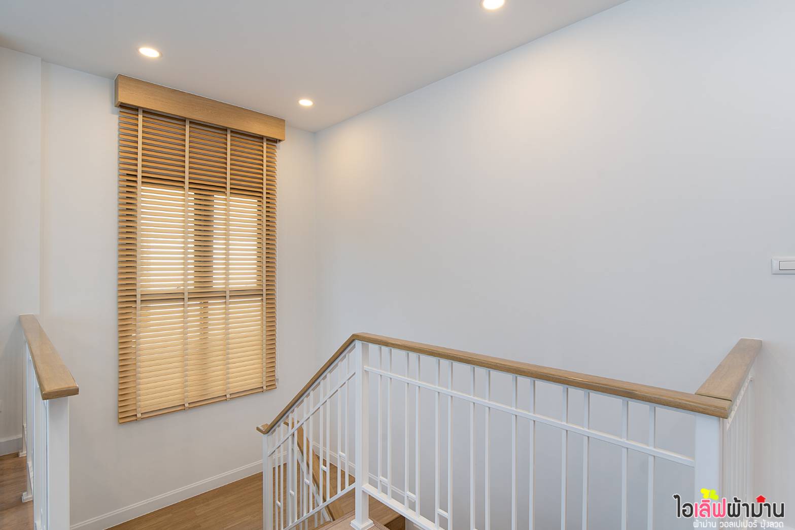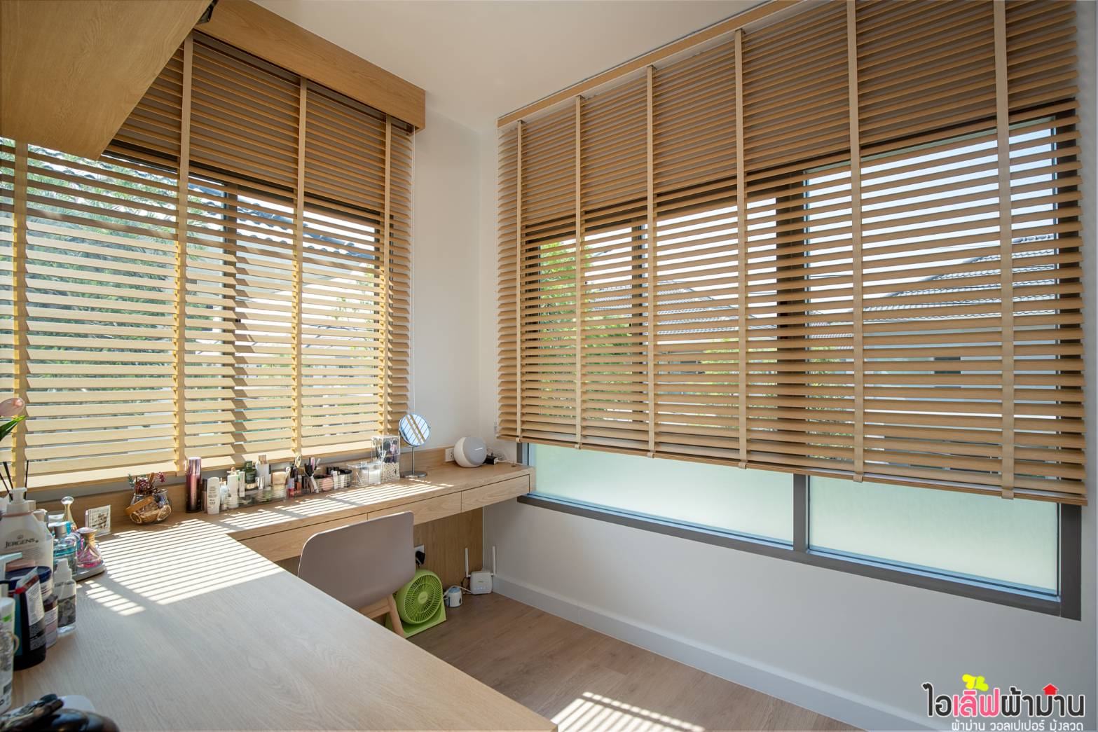 ส่วนมู่ลี่จะเป็นมู่ลี่ไม้ เลือกสีที่เป็นธรรมชาติตัดกับเทปสีขาวงาช้าง ระบบโซ่วน วัสดุจากWinterior