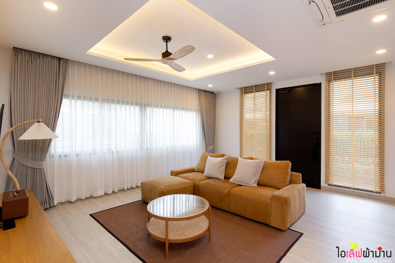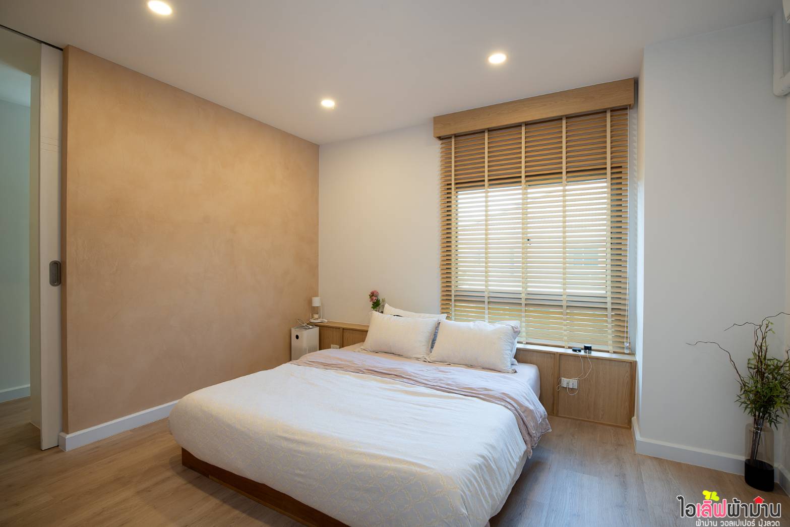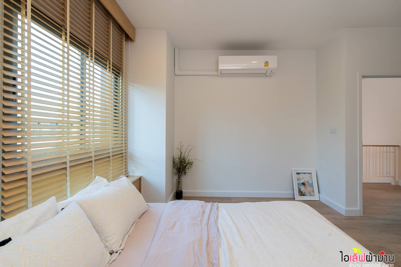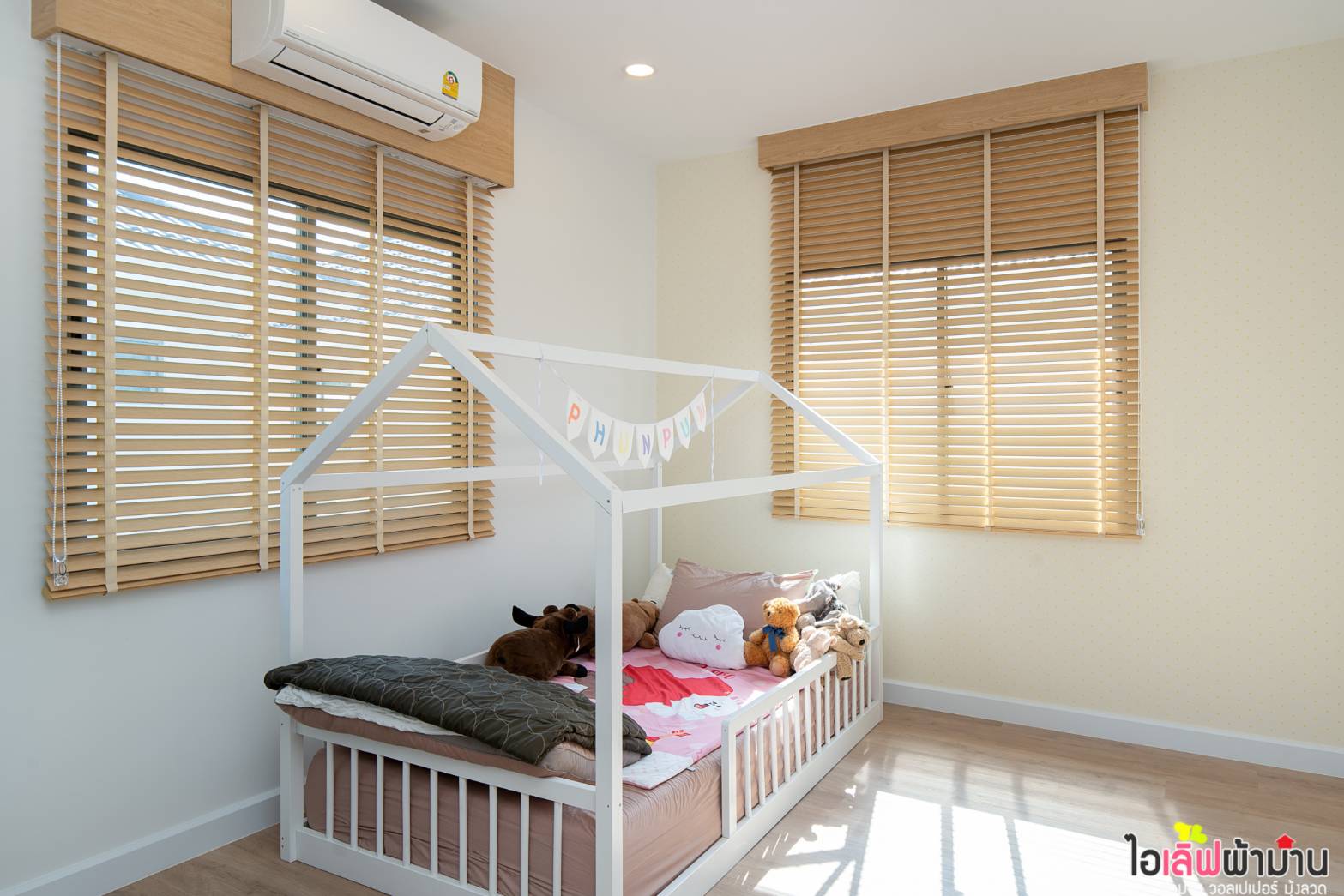 ส่วนมู่ลี่จะเป็นมู่ลี่ไม้ เลือกสีที่เป็นธรรมชาติตัดกับเทปสีขาวงาช้าง ระบบโซ่วน วัสดุจากWinterior