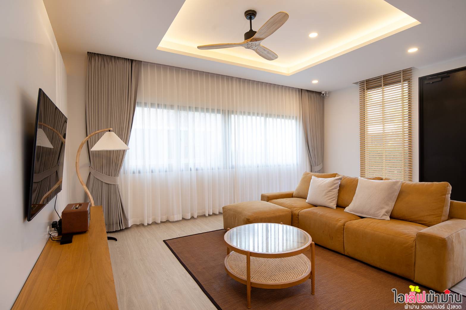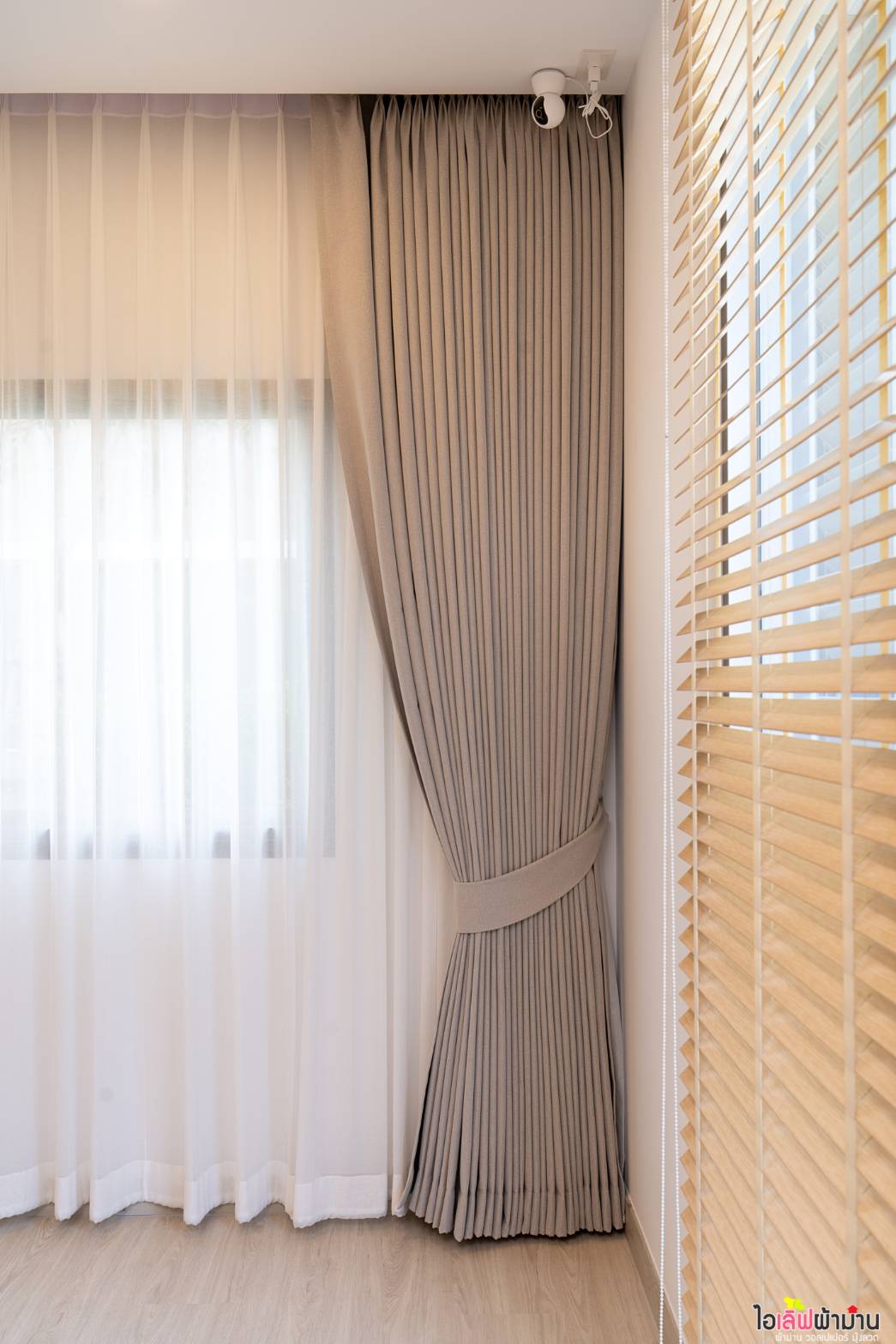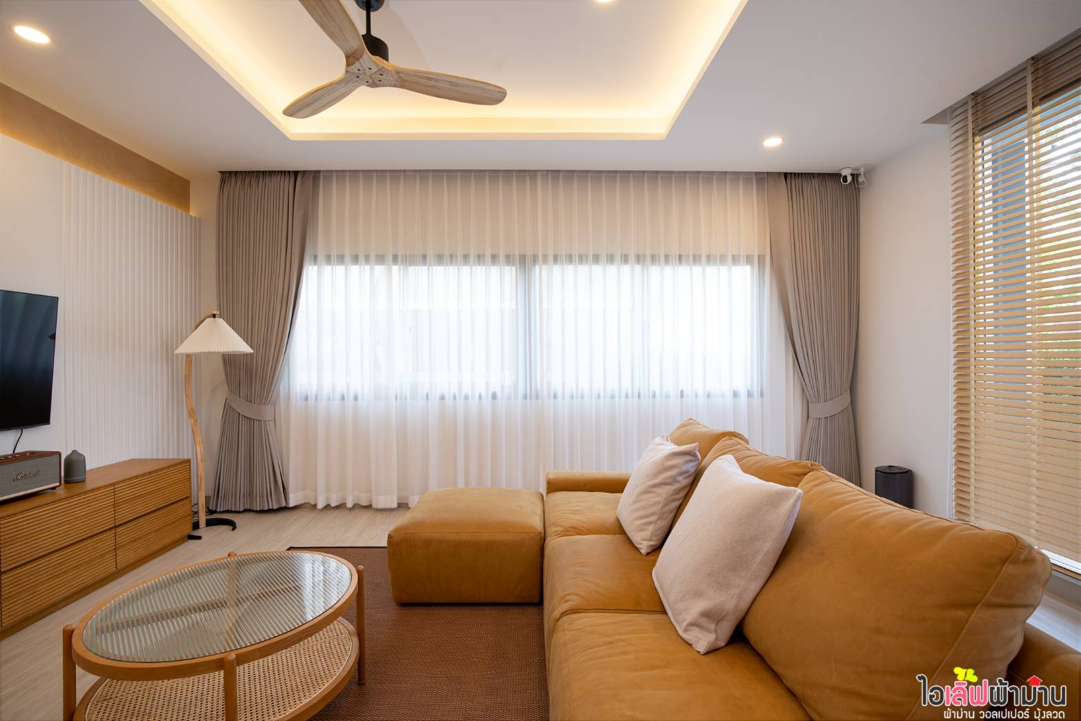 เป็นม่านจีบแบบปล่อยลอน ทั้งผ้าทึบBlackout และผ้าโปร่ง วัสดุผ้าของชาลียา