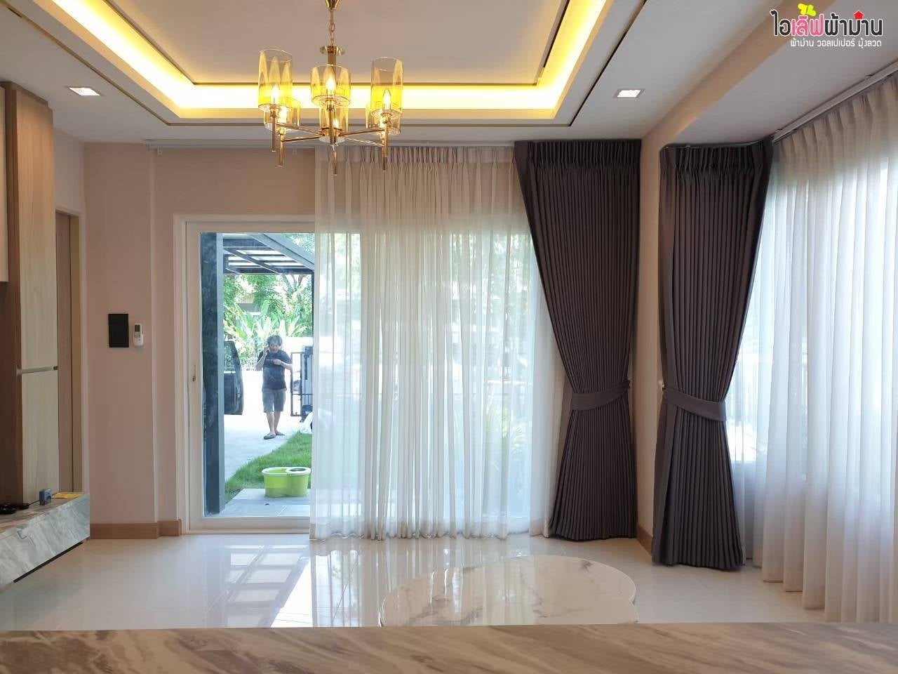 ม่านจีบผ้าทึบแบบปล่อยลอน และผ้าโปร่ง บริเวณ ห้องนอนใหญ่ ห้องนั่งเล่น และห้องทำงาน