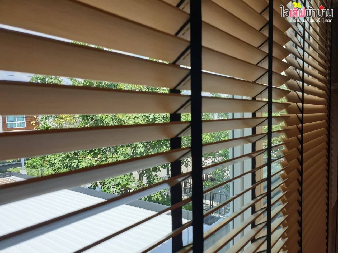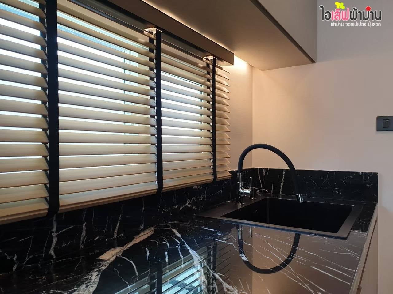มู่ลี่ไม้ เทปผ้าสีดำ ระบบโซ่วน ห้องด้านหน้า ห้องนั่งเล่น และห้องทำงาน